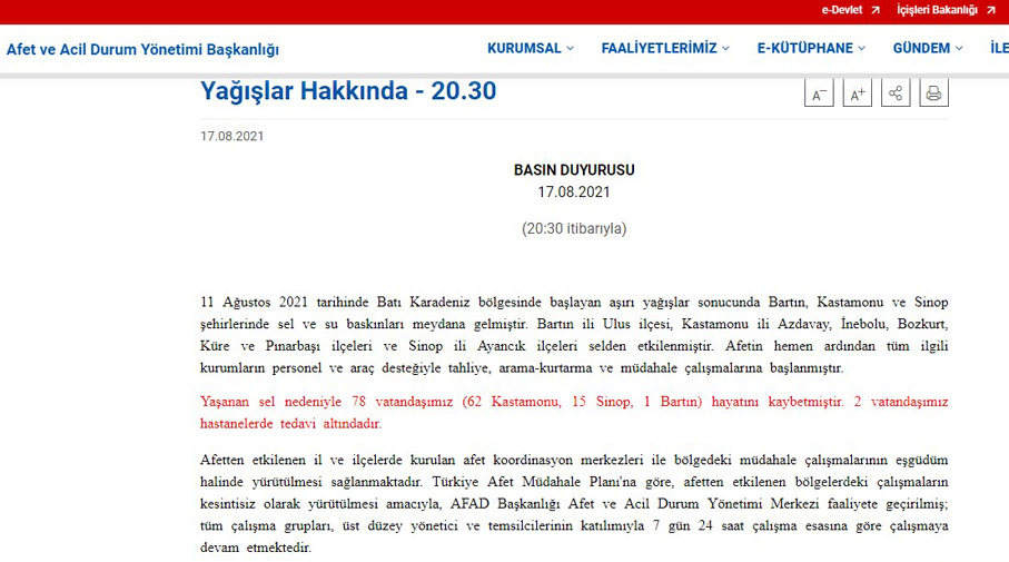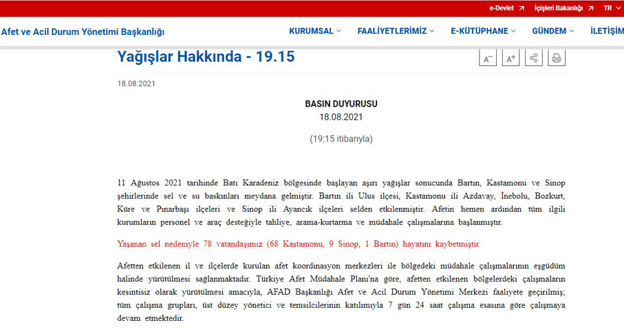 AFAD, 17 Ağustos’ta saat 20.30 itibarıyla yaptığı açıklamada, yaşanan sel nedeniyle 62’si Kastamonu, 15’i Sinop, 1’i de Bartın olmak üzere 78 vatandaşın hayatını kaybettiğini açıklamıştı.