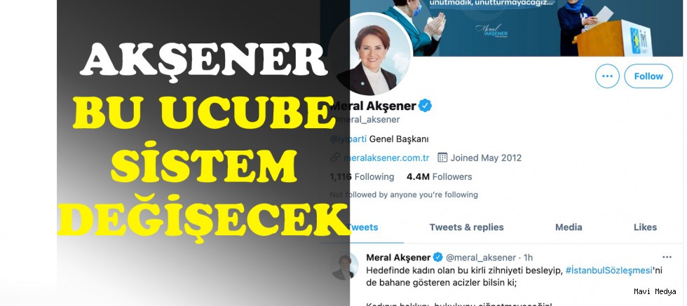 Akşener, twitter hesabındaki paylaşımında, ''Hedefinde Kadın olan bu kirli zihniyeti besleyip İstanbul Sözleşmesi'ni de bahane gösteren acizler bilsin ki; Kadının hakkını, hukukunu çiğnetmeyeceğiz. Bu ucube sistem değişecek İstanbul sözleşmesi yeniden yaşayacak'' dedi.