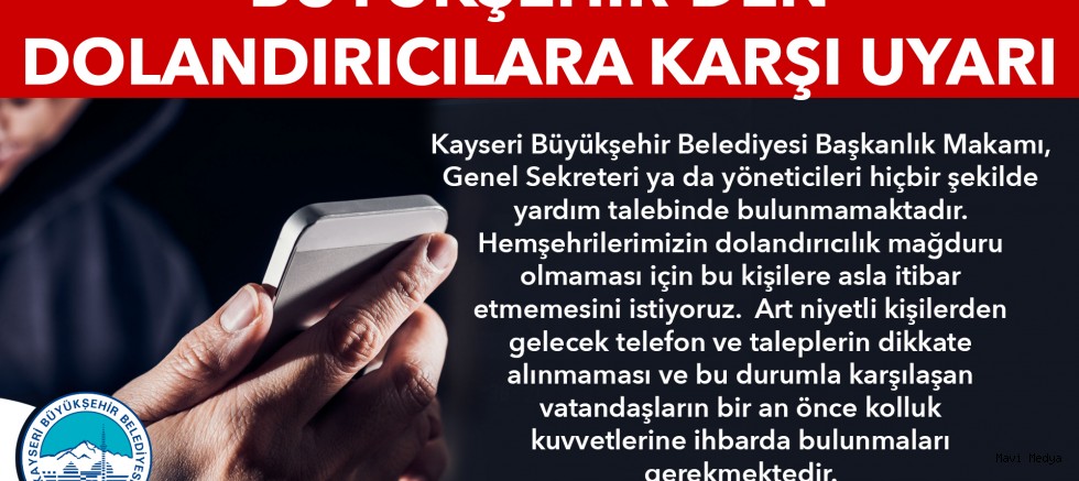 Kayseri Büyükşehir Belediyesi, kurumda görev yapan üst düzey yöneticilerin ismini kullanarak dolandırıcılık yapan art niyetli kişilere karşı vatandaşları uyardı.