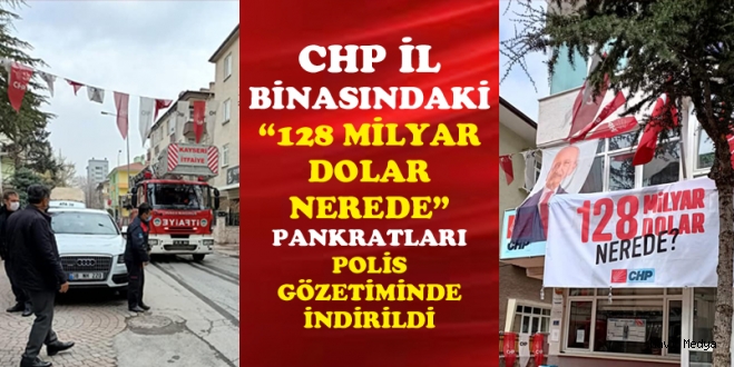 CHP Kayseri İl Binasına asılan . “128 milyar dolar nerede?” pankartı da polis gözetiminde savcılık emri ile itfaiyeciler tarafından indirildi.