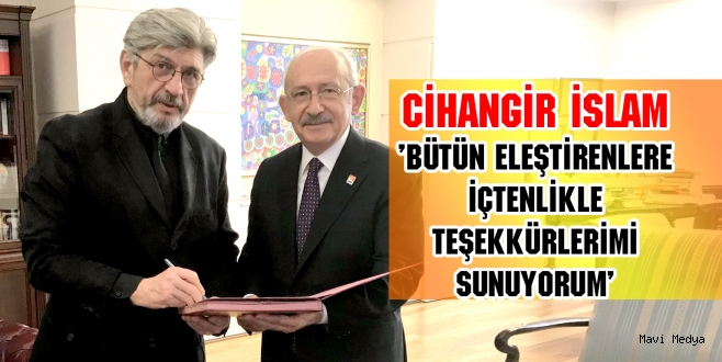 Saadet Partisi'nden geçen yılın mart ayında istifa eden Cihangir İslam, CHP'ye katıldı. İslam'a rozetini dün Meclis'te yapılan grup toplantısında CHP Genel Başkanı Kemal Kılıçdaroğlu taktı. İslam, sosyal medya hesabından konuyla ilgili yaptığı ilk açıklamada şunları kaydetti ''Kararımı destekleyenlere teşekkür ediyorum'' diyen İslam, "İster içeriden ister dışarıdan, bütün eleştirenlere içtenlikle teşekkürlerimi sunuyor, esirgememelerini diliyorum. Saldırılara ve saygısızlıklara bir sözüm yok. Türkiyemizin acil ihtiyacı olan şey normalleşmedir" ifadelerini kullandı.