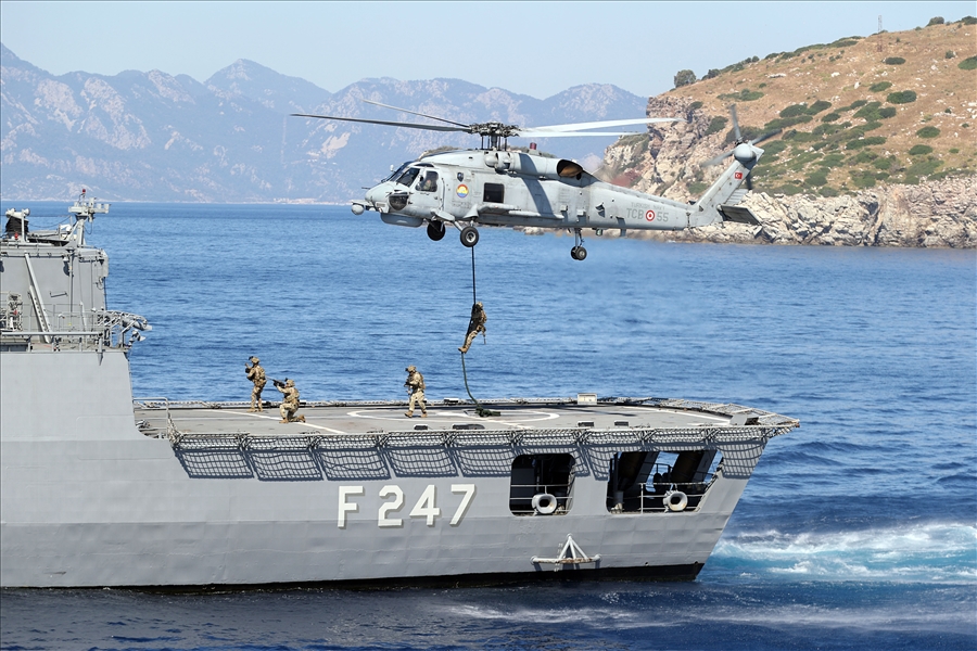 Denizde gemiler arasında akaryakıt ikmalinin de yapıldığı tatbikatta Bayraktar SİHA’dan MAM-L ve Seahawk helikopterinden yapılan Hellfire güdümlü mermi atışları ile hücum botlarından yapılan top atışlarıyla hedefler vuruldu.
