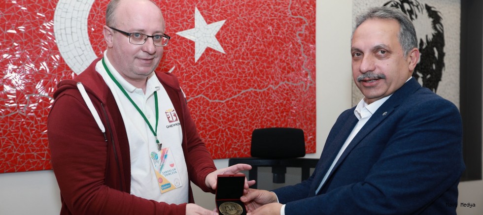 Konuşmasının ardından yabancı heyetten grup liderleri Başkan Yalçın’a yöresel hediyeler takdim ederken, Başkan Yalçın da kendilerine dolma kalem armağan etti.