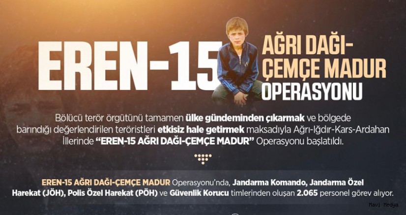 Bölücü terör örgütünü tamamen ülke gündeminden çıkarmak ve bölgede barındığı değerlendirilen teröristleri etkisiz hale getirmek maksadıyla Ağrı-Iğdır-Kars-Ardahan İllerinde Eren-15 Ağrı Dağı-Çemçe Madur Operasyonu başlatıldı.