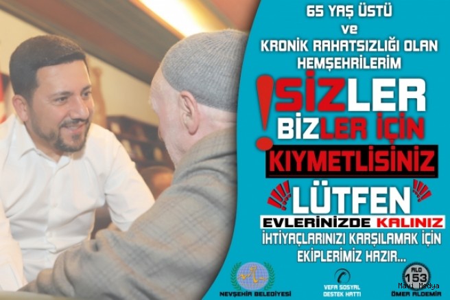 Nevşehir Belediye Başkanı Rasim Arı, koronavirüs (Covid-19) salgını nedeniyle alınan tedbirler kapsamında sokağa çıkmaları yasaklanan 65 yaş üstü ve kronik hastalar için Nevşehir Belediyesi Alo 153 Çağrı Merkezi’nin aynı zamanda ‘Vefa Sosyal Destek Hattı’ olarak hizmet vereceğini belirtti. Evde kalan yaşlıların tüm ihtiyaçları için Nevşehir Belediyesi’nin seferber olduğunu söyleyen Arı, “Gözünü sevdiklerim, bizim için çok kıymetlisiniz. Lütfen evde kalın.” dedi.