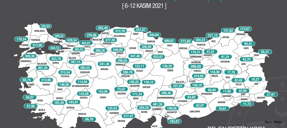 6 Kasım- 12 Kasım günleri arasında il bazında her 100 bin kişide Covid-19 vaka sayıları açıklandı. Buna göre, en yüksek vaka sayısı bu hafta Ordu'da 499,87 ile kaydedildi.