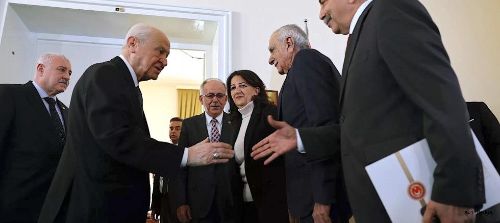 Bahçeli, MHP Grubu'nu ziyaret eden TBMM Meclis Başkanvekili Sırrı Süreyya Önder ve DEM Parti Van Milletvekili Pervin Buldan'dan oluşan "İmralı heyeti" ile Ahmet Türk'ü makam odasının kapısında karşıladı.
