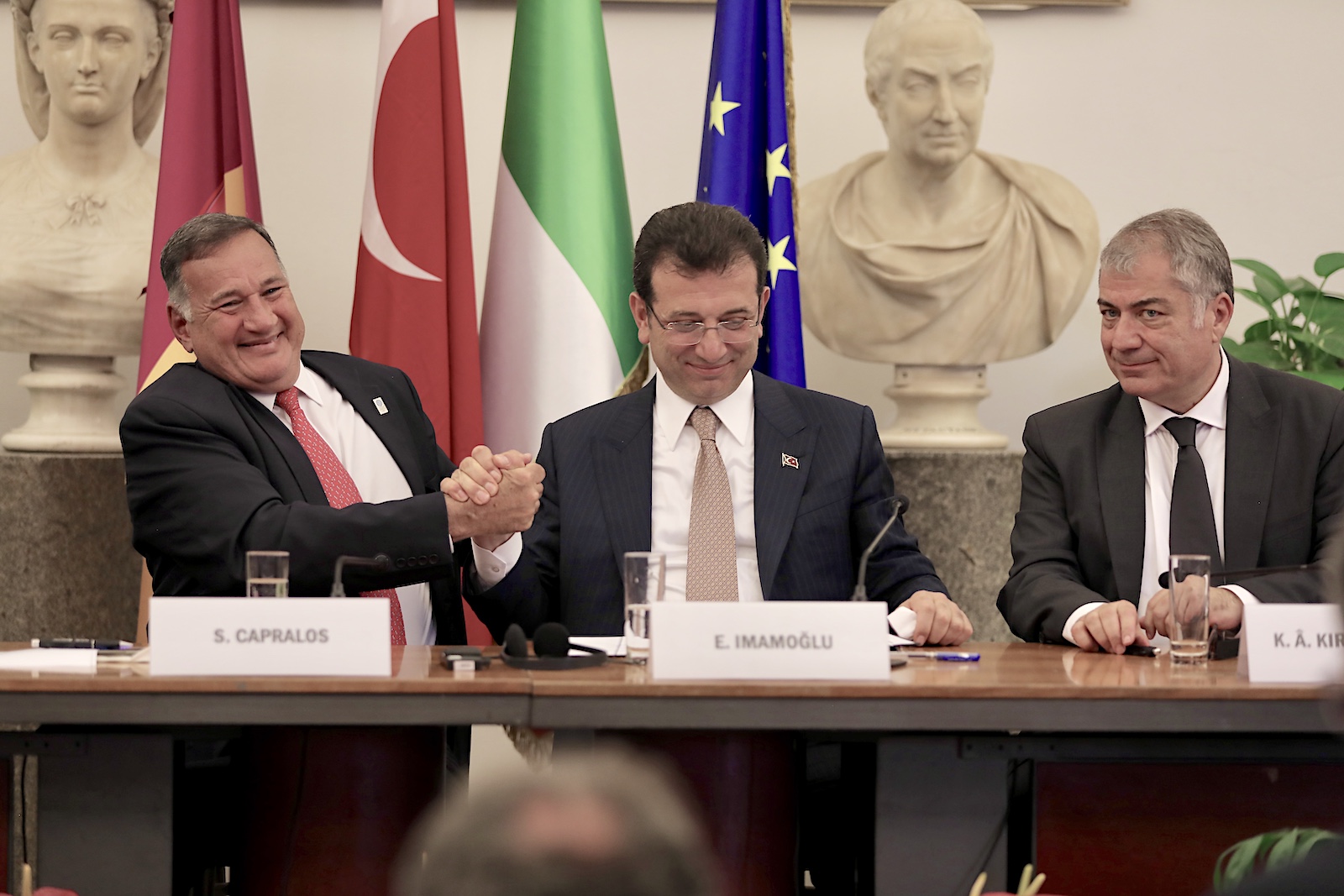 Sala della Protometeca’da düzenlenen imza töreni öncesinde Malago, Capralos, Kiremitçioğlu ve İmamoğlu birer konuşma yaptı.
