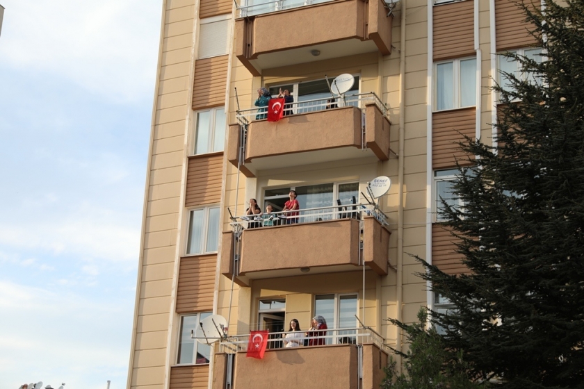 İlçe sakinleri de evlerinin balkonlarına ve pencerelerine çıkarak, marşlara