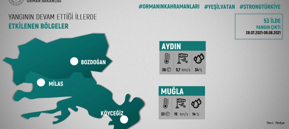 Böylece, son 13 günde, 53 ilde çıkan toplam 270 orman yangınının 268’i kontrol altına alındı ya da söndürüldü. Muğla'nın Köyceğiz ve Milas ilçelerindeki yangınların kontrol altına alınmasına yönelik çalışmalar ise sürüyor.