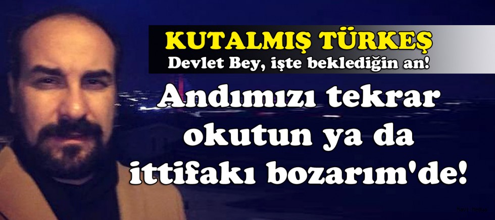 Kutalmış Türkeş, MHP genel Başkanı Devlet Bahçeli’ye Andımızın okullarda okunmasının yasaklanması üzerinden seslenerek, “Devlet Bey, işte beklediğin an! Geç karşılarına: Devlet sözüm var Andımızı tekrar okutun ya da ittifakı bozarım' de!” dedi.