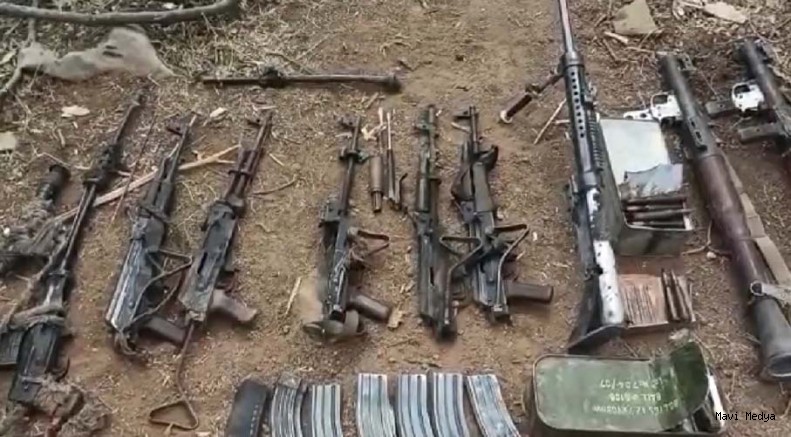 Açıklamada, başarıyla devam eden “Pençe-Yıldırım” operasyonu kapsamında tespit edilen mağarada PKK’lı teröristlere ait 1 adet Zagros keskin nişancı tüfeği, 1 adet Dragunov keskin nişancı tüfeği, 5 adet AK-47 piyade tüfeği, 1 adet M-16 piyade tüfeği namlusu, 2 adet RPG-7 roketatar, 2 adet AK-47 piyade tüfeği şarjörü, 1 adet Dragunov keskin nişancı tüfeği şarjörü, 1 adet Zagros keskin nişancı tüfeği şarjörü, 6 adet M-16 piyade tüfeği şarjörü, 250 metre inflaklı fitil, 3 bin adet AK-47 piyade tüfeği mühimmatı, 3 bin adet 7.62 mm PKMS makinalı tüfek mühimmatı, 6 adet RPG-7 roketatar mühimmatı, 6 adet havan mühimmatı, 19 adet EYP ana imla hakkı, 3 adet havan tapası, 200 adet fünye, 120 adet pil bloğu, 1 adet voltmetre, 3 adet Yaesu telsiz anteni ele geçirildiği kaydedildi.