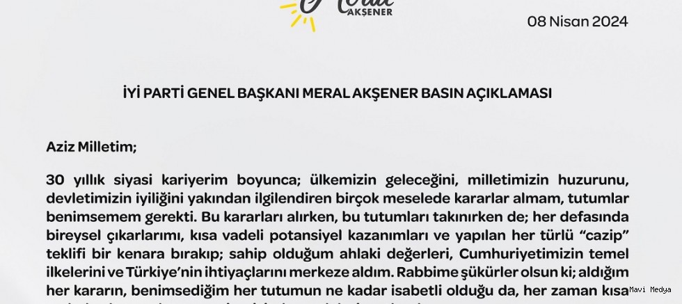 Bildiğiniz üzere, 31 Mart 2024 Mahalli idareler seçimleri öncesinde İYİ Parti olarak; yetkili kurullarımızın kararı doğrultusunda seçimlere hür ve müstakil olarak girmeyi tercih ettik. Bu kararı almamızdaki gayemiz; partimizi Türkiye'de gittikçe yerleşik hâle gelen siyasi kutupların yörüngesinden çıkartmak, milletimize de iki seçenek arasına sıkıştırıldığı rekabetsiz siyasetten kurtaracak nitelikte yeni bir seçenek sunarak ülkemize toplumsal, siyasi ve kurumsal çerçevede zararların hep beraber deneyimlediğimiz kutuplaşma ortamına son vermek için ilkesel bir adım atmaktı.