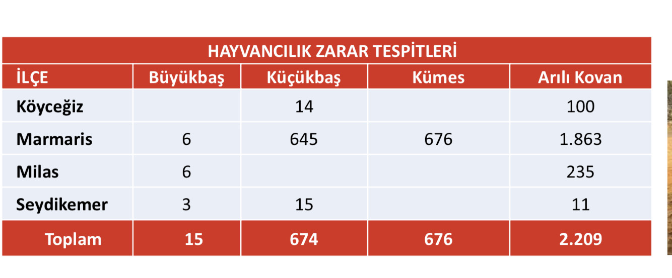 Muğla Valiliği'nden alınan bilgiye göre, "Hayvancılık zarar tespit tutanakları"na yansıyan rakamlara göre, kentin Köyceğiz, Marmaris, Milas, Seydikemer ilçelerinde yaşanan orman yangınları, geçimlerini hayvancılıkla sağlayan yöre halkını da büyük zarar verdi. Yangınlarda, 15 büyükbaş, 674 küçükbaş ve 676 kümes hayvanı telef oldu.