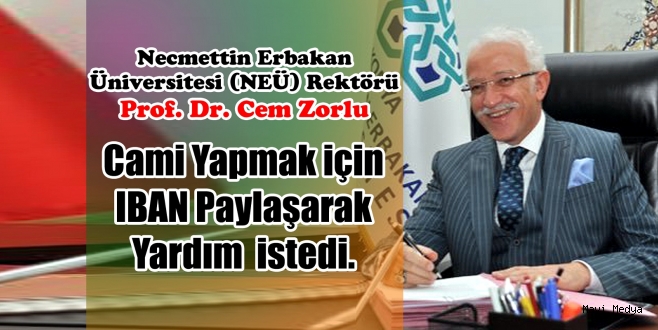 NEÜ Rektörü Eski AKP Milletvekili Cem Zorlu kendisine ait sosyal medya hesabından Konya’nın en büyük camiini yapmak için IBAN paylaşarak yardım talep etti. Paylaşımın ardından bir çok öğrenci tepki gösterdi.