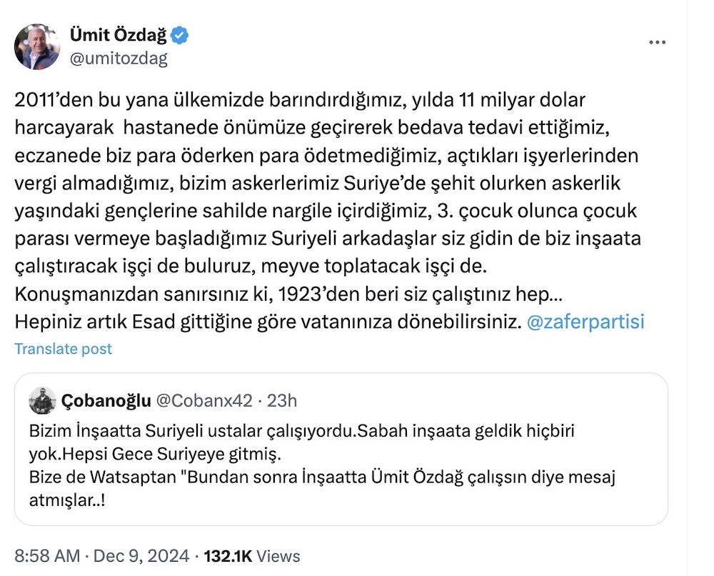 Zafer Partisi Genel Başkanı Ümit Özdağ, sosyal medyadan yaptığı paylaşımda Suriyelilere "Esad gittiğine göre vatanınıza dönebilirsiniz" diye seslendi.