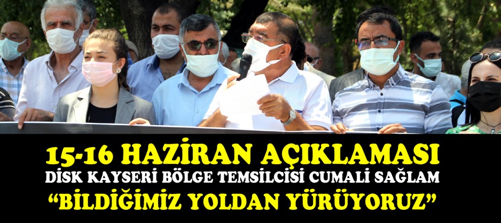 "Yaşasın 15-16 Haziran direnişimiz", "Faşizme karşı omuz omuza", "İşçilerin birliği sermayeyi yenecek", "Bildiğimiz yoldan yürüyoruz" sloganları atan işçi ve emekçiler adına açıklamayı DİSK Kayseri Bölge Temsilcisi Cumali Sağlam okudu.