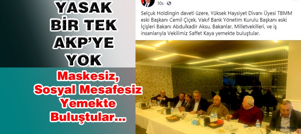AKP milletvekili Saffet Kaya sosyal medya hesabından dikkat çeken bir fotoğraf paylaştı. Yapılan toplantıdaki yemek sırasında çekilen fotoğrafta yemektekilerin maskesiz olduğu ve sosyal mesafe kurallarına uymadığı görülüyor.