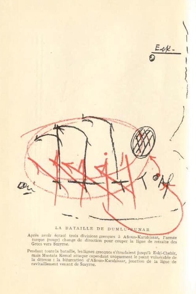 “Mustafa Kemal, yine bütün savaş ilminin kaidelerini ve metinlerini bir yana itmişti. Görüşmelerimiz sırasında, bana bu olayı anlatırken çizdiği krokiye bakılınca, baskın şekli bütün açıklığıyla görülecektir: Kuzeye doğru uzanan mavi çizgiler, Yunanların Afyonkarahisar’ından (Krokide Af. diye gösteriliyor) geriye, Eskişehir’e (krokide Esk.) doğru çekildiklerini gösteriyor. Şuna da dikkat edininiz ki, taarruzdan hemen sonra ve Yunanların ricatı üzerine, Türk hatları da sola, güney batıya doğru keskin bir dönüş yapmaktadır. Ve bunun üzerine kuzeye doğru kaçmakta olan Yunanlar, birdenbire batıya dönmektedirler. Bu durum gösteriyor ki, Yunanlar, kendilerini takip eden Türk kuvvetleriyle teması kaybedince ‘Bunlara ne oldu?’ diye paniğe kapılmışlardır. Kendilerini takip eden Türk kuvvetlerinin peşlerini bırakarak güneybatıya doğru ilerlediklerini ve böylece Yunan kuvvetlerinin İzmir’le irtibatlarını kesmekte olduklarını çok geç anlamışlardı! Diğer taraftan Türk süvarileri düşmanın sağ cenah gerisine doğru ilerlemiş ve Yunan Genel Karargâhı ile Eskişehir-Afyon mıntıkasındaki birliklerinin her türlü bağlantısını kesmişti.