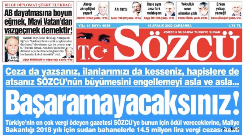 Sözcü gazetesi, gazeteye kesilen vergi cezasını bugünkü manşetinde "Ceza da yazsanız, ilanlarımızı da kesseniz, hapislere de atsanız Sözcü'nün büyümesini engellemeyi asla ve asla başaramayacaksınız" diyerek duyurdu.