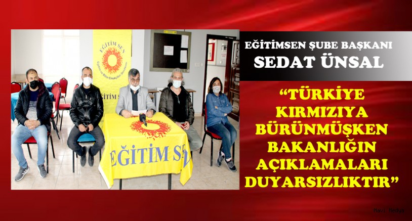 Eğitim-Sen Kayseri Şube Başkanı Sedat Ünsal, sendika binasında yönetim kurulu ve üyelerinde katılımıyla pandemi sürecinde artan vakalara dikkat çekerek " Birçok il ve bölge kırmızıya dönerken hiç rahatsızlık duymadan yapılan bu açıklamalar Bakanlığın duyarlılıktan ne denli uzak olduğunu ortaya koymaktadır." dedi