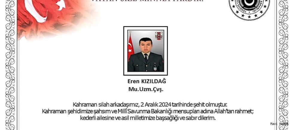 "Pençe-Kilit operasyonu bölgesinde, 16 Kasım 2024 tarihinde bölücü terör örgütü mensupları tarafından açılan taciz ateşi sonucu ağır yaralanan ve Gülhane Eğitim ve Araştırma Hastanesinde tedavisine devam edilen kahraman silah arkadaşımız Mu.Uzm.Çvş. Eren Kızıldağ yapılan tüm müdahalelere rağmen kurtarılamayarak 2 Aralık 2024 tarihinde şehit olmuştur.