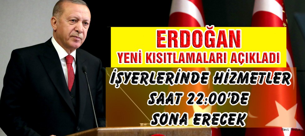 Cumhurbaşkanı Erdoğan, “Paket servis hariç olmak üzere lokanta, restoran, pastane ile, berber, düğün salonu, yüzme salonu, hamam, kaplıca, internet kafe, halı saha, tiyatro, konser salonu vb. tüm işyerlerinde hizmetler saat 22.00’de sona erecektir” dedi.
